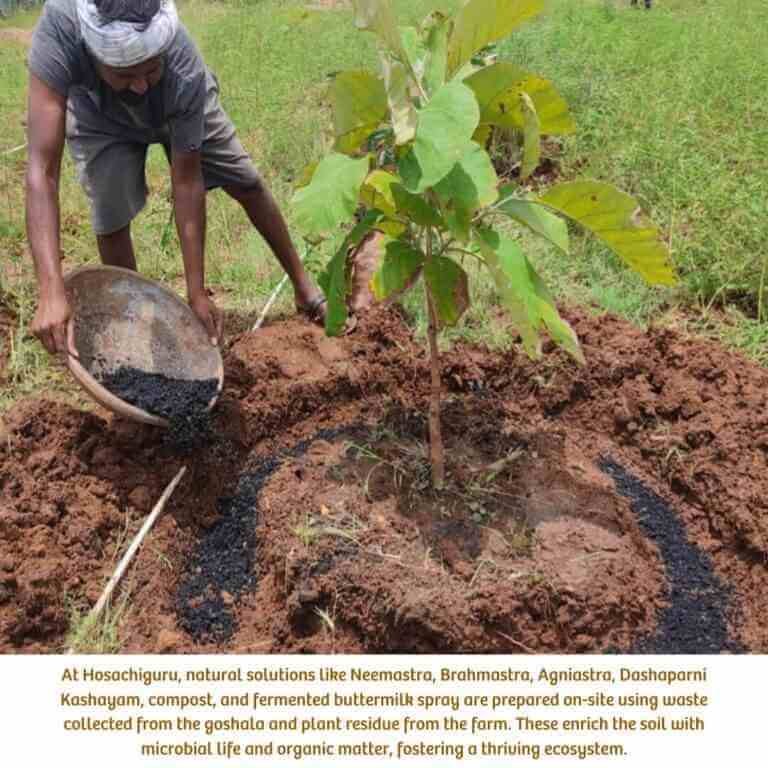 At Hosachiguru, natural farming techniques are strengthened by the use of organic astras such as Neemastra, Brahmastra, Agniastra, Dashaparni Kashayam, and fermented solutions. These natural preparations are made using farm-based resources like neem leaves, cow urine, plant residues, and fermented plant extracts. They serve as effective pest management solutions, protecting crops without disrupting the ecological balance.