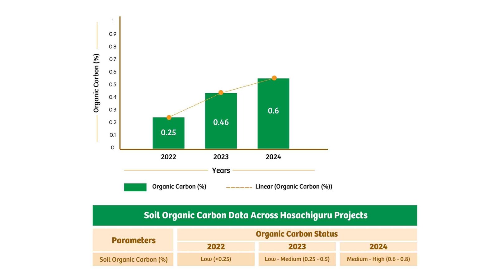 This world soil day, as the spotlight falls on the theme of “Caring for Soils,” Hosachiguru is proud to showcase a remarkable milestone in sustainable agriculture. Over the past three years, we’ve achieved an outstanding over 100% increase in organic soil carbon content, reflecting our unwavering commitment to regenerative soil management.